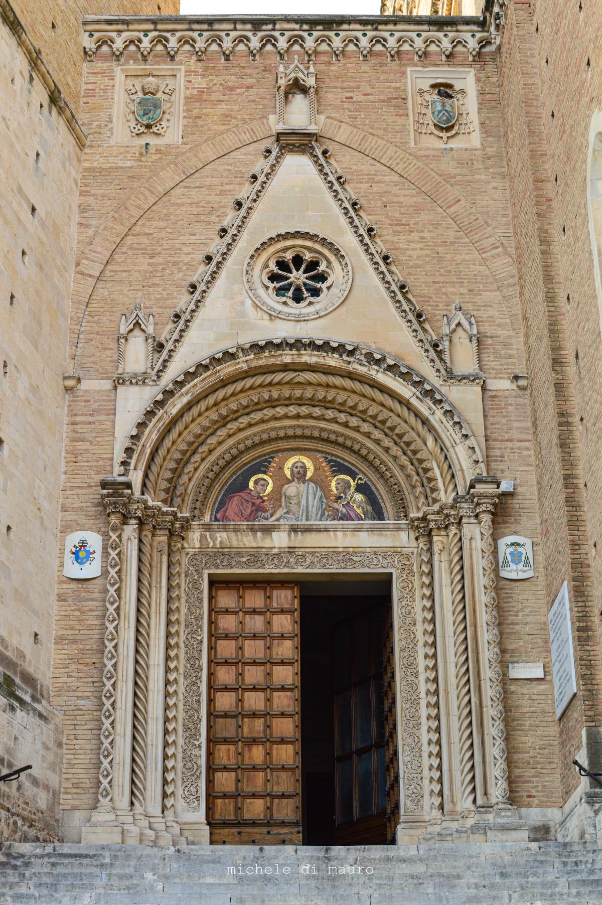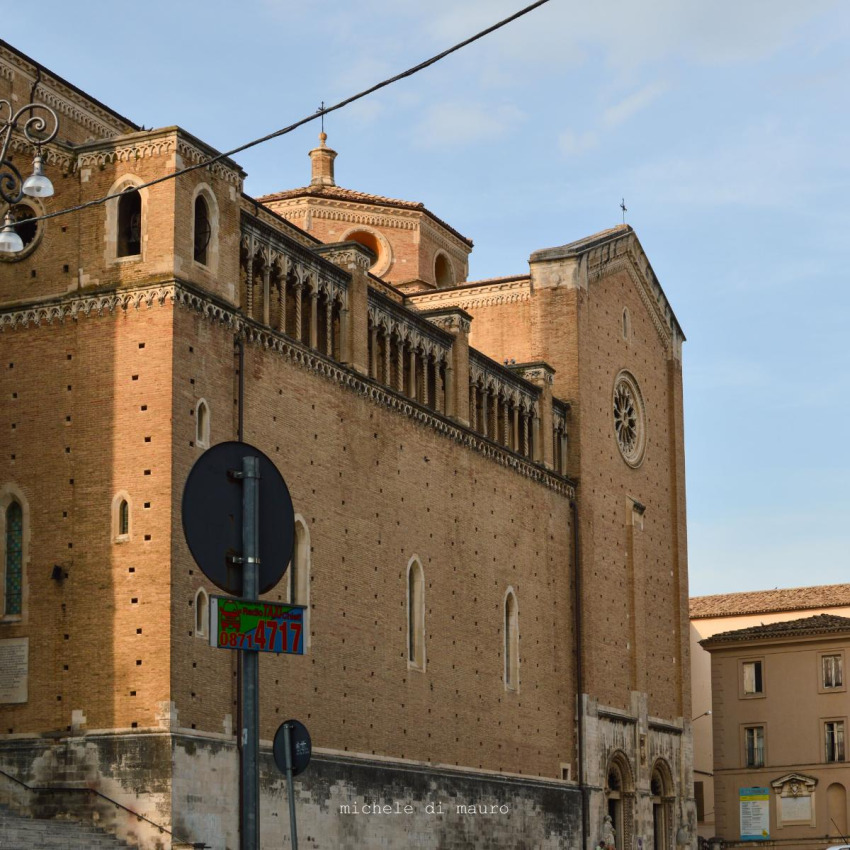 Cattedrale di San Giustino, a Chieti. Il santo teatino, vescovo della diocesi, è venerato nella cattedrale e luogo di culto principale della città, ove riposano le sue spoglie mortali. La struttura si ritiene risalire al V secolo, sebbene le fattezze attuali siano il risultato di rimaneggiamenti e ripristini occorsi nel tempo. A causa delle distruzioni che si sono verificate nel Medioevo, infatti, l’area che oggi accoglie la cattedrale è stata caratterizzata da diverse costruzioni, culminate nelle forme odierne dettate dal restauro novecentesco.