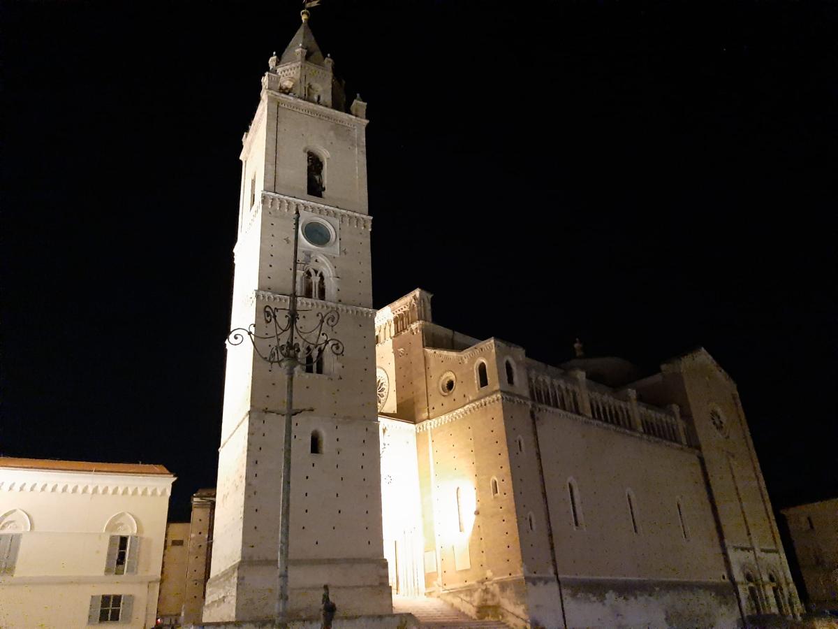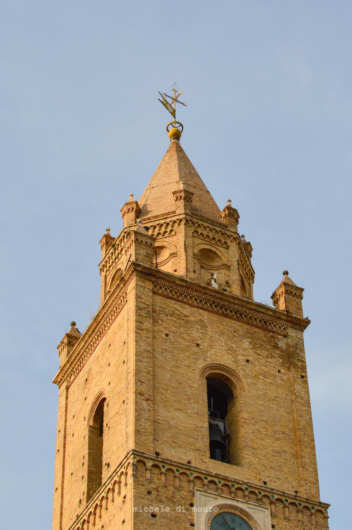 La caratteristica facciata, con il portale principale arretrato e posto di fianco alla torre campanaria, si contraddistingue per la splendida scalinata e per il mosaico che raffigura i santi Giustino e Tommaso ai lati del Cristo, dedicatari della chiesa in epoche diverse. Anch’essa risale alle opere dello scorso secolo. Il campanile è diviso in sezioni, appartenenti a momenti diversi, la cui base è datata al XI secolo, la cui cuspide che sovrasta la porzione contenente le campane omaggia quella della cattedrale di Atri, a pianta ottagonale.